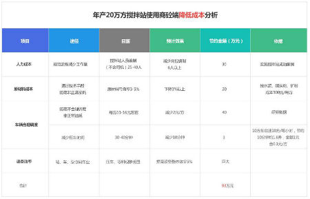 采用砼友商砼端后,为企业降低成本节约资金93万元。其中,通过规范流程,减少工作量,规范车辆调度,对原材料非正常损耗进行技术防范,节约人力成本30万、车辆调度费用43万、原材料成本20万。