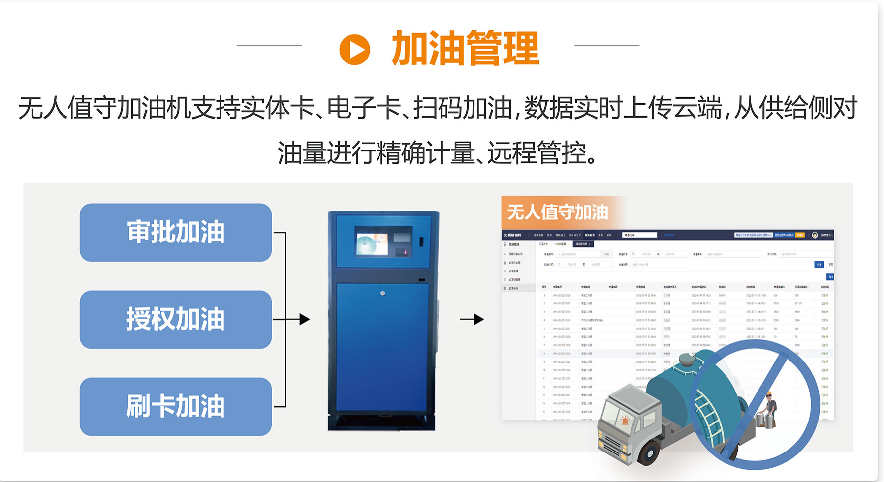 无人值守加油机支持实体卡、电子卡、扫码加油,数据实时上传云端,从供给侧对油量进行精确管理